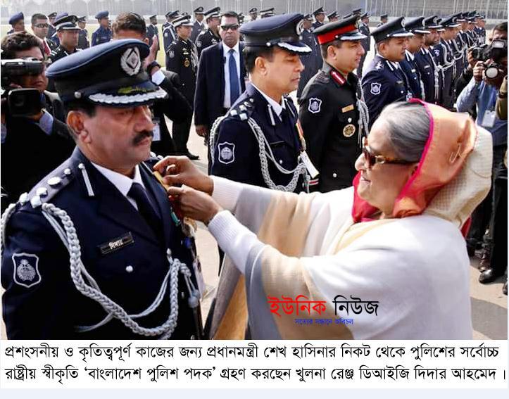 খুলনা : প্রশংসনীয় ও কৃতিত্বপূর্ণ কাজের জন্য পুলিশের সর্বোচ্চ রাষ্ট্রীয় স্বীকৃতি ‘বাংলাদেশ পুলিশ পদক’ (বিপিএম) পেয়েছেন খুলনা রেঞ্জ ডিআইজি দিদার …