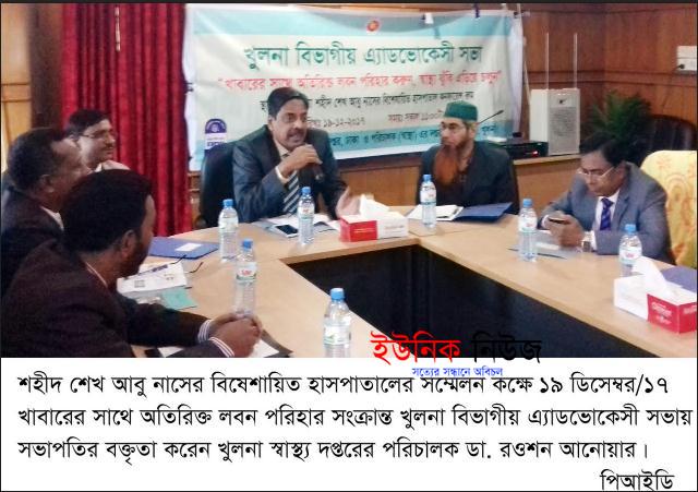খুলনা : খাবারের সাথে অতিরিক্ত লবন পরিহার সংক্রান্ত খুলনা বিভাগীয় এ্যাডভোকেসী সভা মঙ্গলবার সকালে শহীদ শেখ আবু নাসের বিষেশায়িত হাসপাতালের …