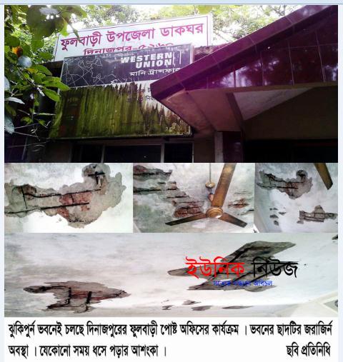 মেহেদী হাছান উজ্জল, ফুলবাড়ী (দিনাজপুর) : ঝুকিপুর্ন ভবনেই চলছে দিনাজপুরের ফুলবাড়ী পোষ্ট অফিসের কার্যক্রম । ভবনের ছাদটির জরাজির্ন অবস্থা । …