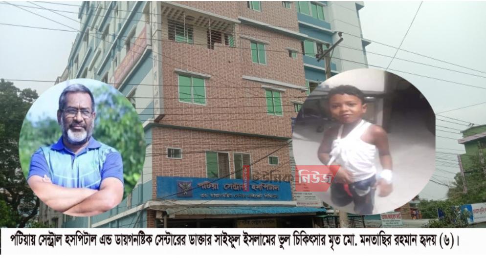 চট্টগ্রাম ব্যুরো:চট্টগ্রামের পটিয়ায় সেন্ট্রাল হসপিটাল অ্যান্ড ডায়াগনস্টিক সেন্টারের ডাক্তার সাইফুল ইসলাম ও ডাক্তার আবু ছালেকের ভুল চিকিৎসার কারণে মো. মনতাছির …