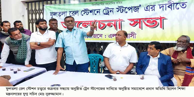 ফুলতলা (খুলনা) প্রতিনিধি// ফুলতলা রেল স্টেশনে ট্রেন স্টপেজ এর দাবিতে শুক্রবার সন্ধ্যায় (২৯/১১/২৪) এলাকাবাসীর উদ্যোগে এক সমাবেশ অনুষ্ঠিত হয়। শ্রমিক …