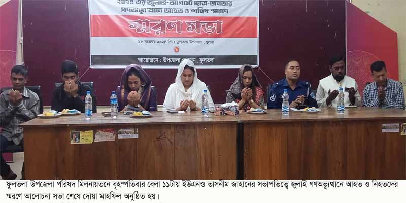 ফুলতলা (খুলনা) প্রতিনিধি// জুলাই-আগষ্টের ছাত্র-জনতার গণঅভ্যূত্থানে আহত ও শহীদদের স্মরণে ফুলতলা উপজেলা প্রশাসনের উদ্যোগে এক আলোচনা সভা ও দোয়া মাহফিল …