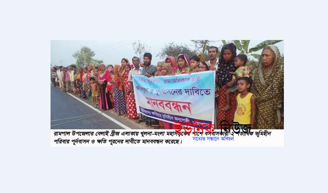 রামপাল (বাগেরহাট) প্রতিনিধি : রামপাল উপজেলার বেলাই ব্রীজ এলাকায় খুলনা-মংলা মহাসড়কে ঘন্টাব্যপী ২ শতাধিক ভূমিহীন পরিবার পূর্নবাসন ও ক্ষতি পূরনের …