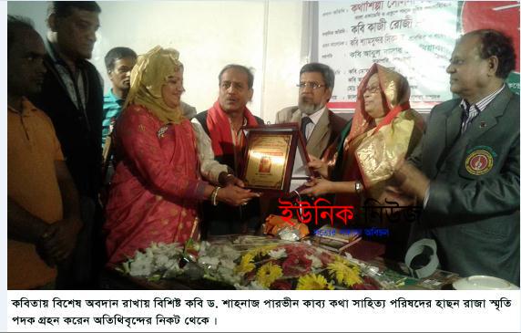রবিউল ইসলাম মিটু, যশোর : নৈঃশব্দ্যের কবি ড. শাহনাজ পারভীনকে বাংলা কবিতায় বিশেষ অবদান রাখায় কাব্যকথা সাহিত্য পরিষদ ‘হাছন রাজা …
