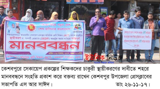 এস আর সাঈদ, কেশবপুর (যশোর) : যশোরের কেশবপুরে সেকায়েপ প্রকল্পের শিক্ষকদের চাকুরী স্থায়ী করণের দাবীতে রবিবার দুপুরে শহরের মেইন সড়কে …
