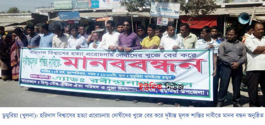 ডুমুরিয়া(খুলনা)প্রতিনিধিঃ খুলনার ডুমুরিয়া উপজেলার জিলেরডাঙ্গা গ্রামের ধনাঢ্য যুবক হরিদাস বিশ্বাসের হত্যার প্ররোচনায় দোষীদের দৃষ্টান্ত মূলক শাস্তির দাবীতে মানব বন্ধন কর্মসূচী …